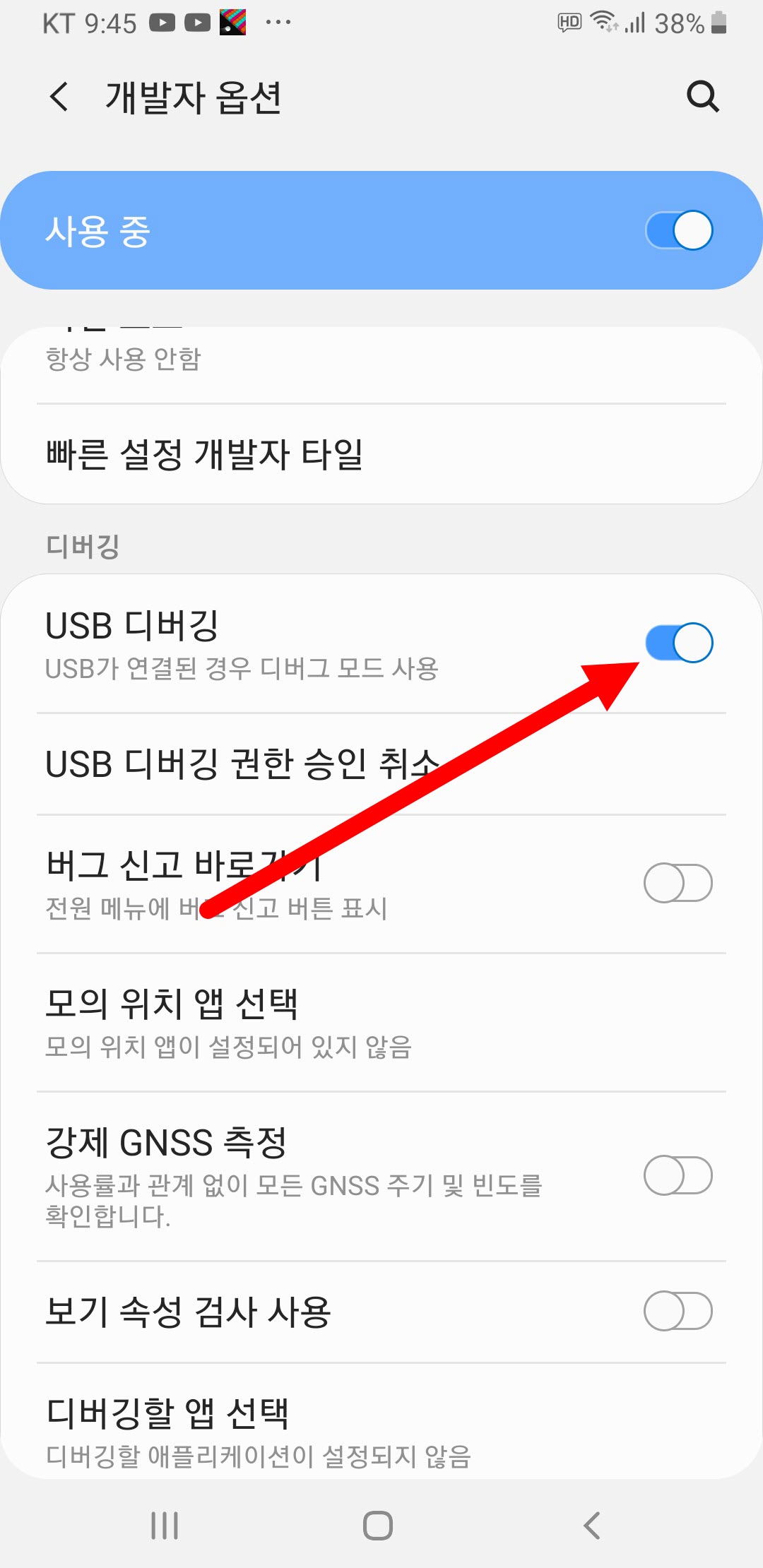 8)USB 디버깅을 허용하려면 개발자 옵션의 USB 디버깅을 활성화합니다.