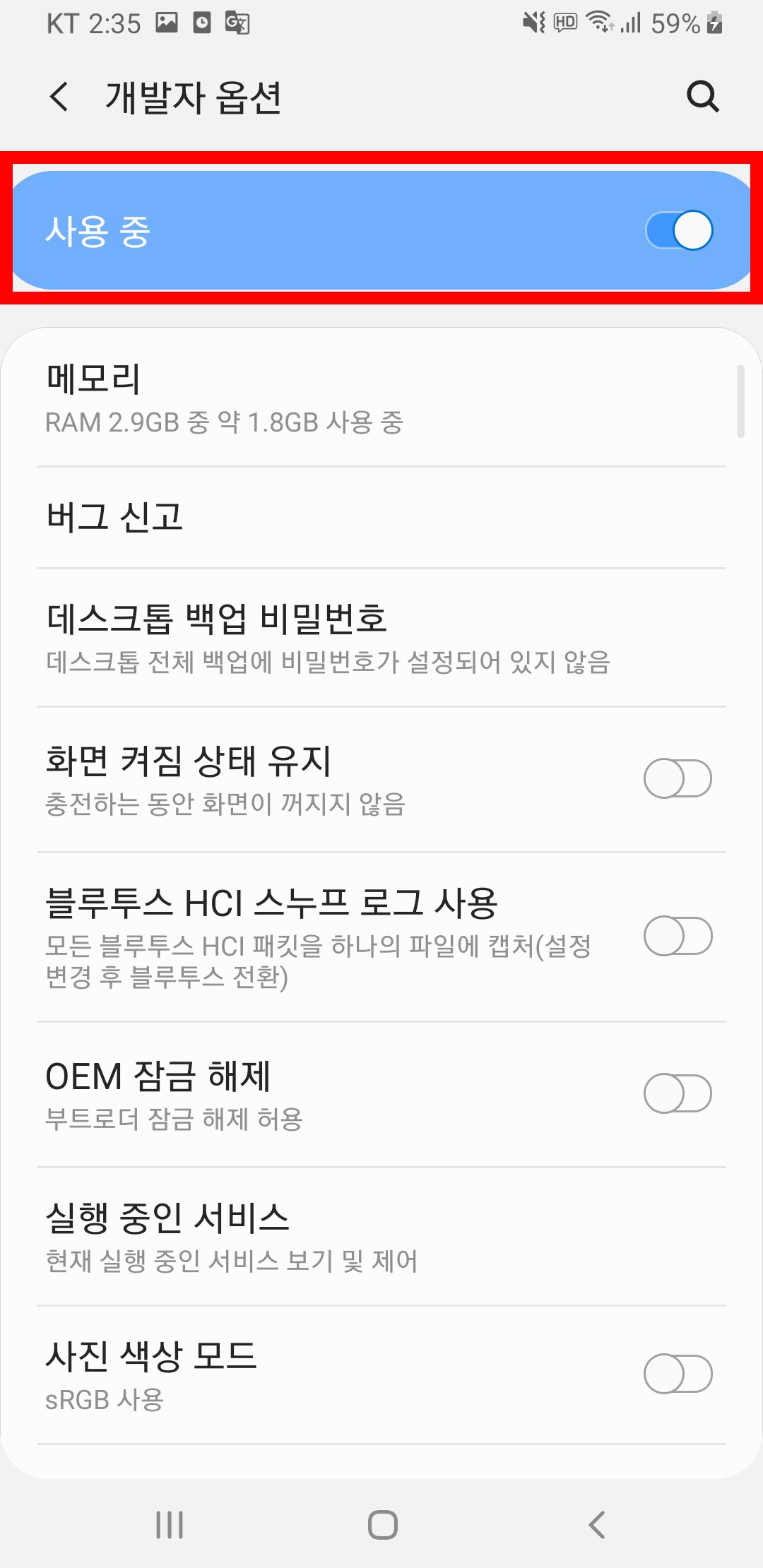 8)USB 디버깅을 허용하려면 개발자 옵션의 USB 디버깅을 활성화합니다.