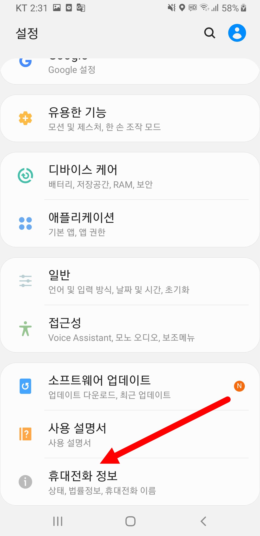 초기 설정 메뉴로 이동하면 휴대전화 정보 메뉴 하단에 개발자 옵션 메뉴가 표시된것을 확인할수있습니다.