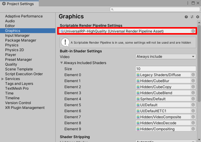 7)UPR 프로젝트에서 project settings의 graphics로이동한다. scriptable render pipeline settings 하단에 위치한 UPR 에셋을 선택한다.
