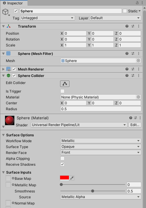 2)게임 오브젝트의 재질을 설정한다. 예에서 URP의 Lit 쉐이더를 사용하는 재질을 설정하였다.