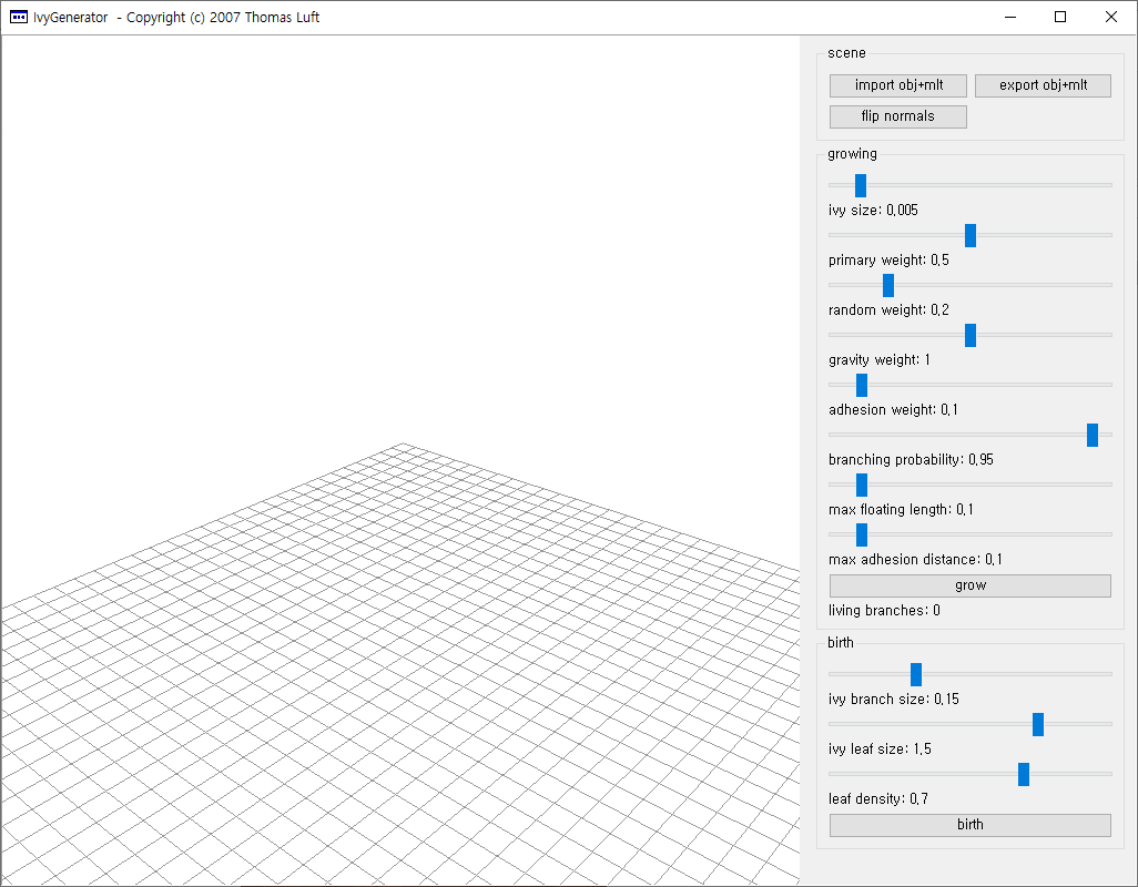3)birth를 클릭하면 ivy의 지오메트리를 생성한다. export를 사용하여 생성한 지오메트리를 obj파일로 저장할수있다.