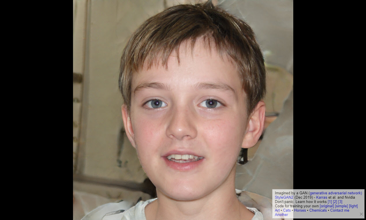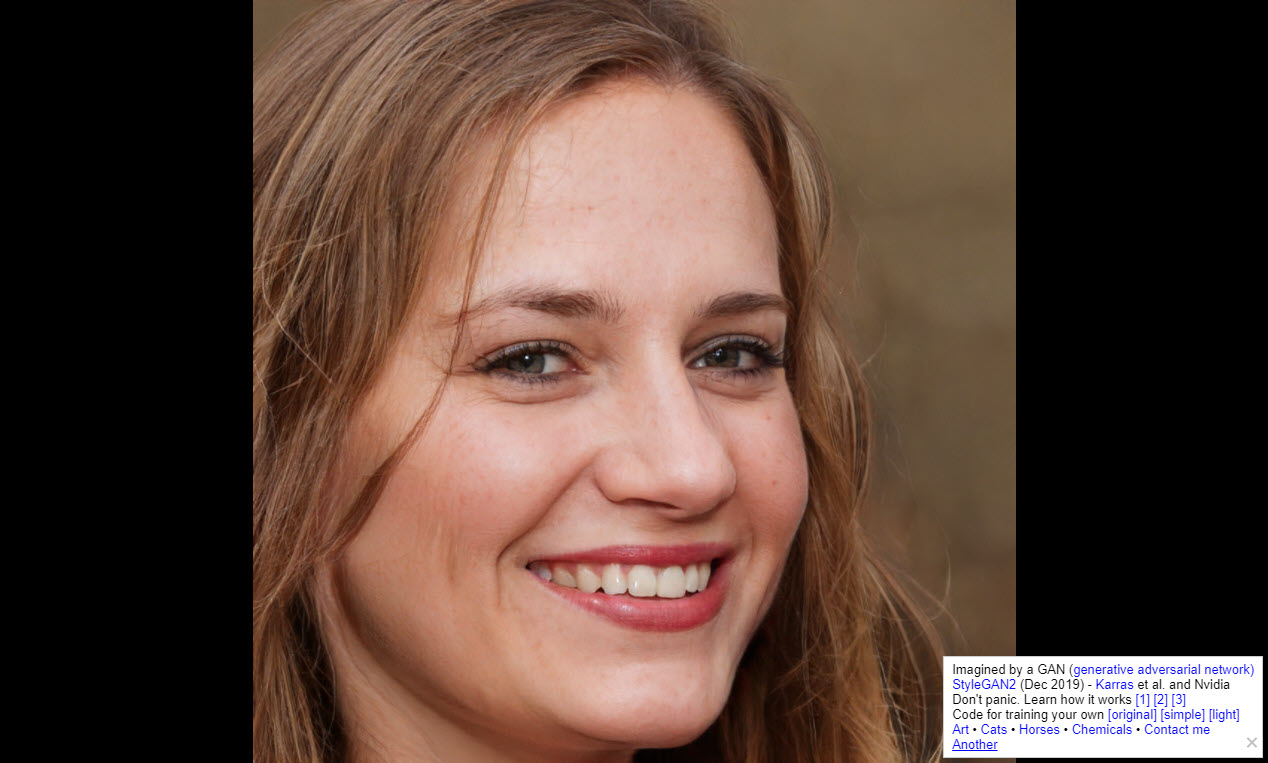 아래 웹사이트에 접속하면 StyleGAN으로부터 자동으로 생성한 인물, 고양이, 아트 이미지들을 확인할수있다. StyleGAN는 엔비디아에서 소개한 GAN(생성적 적대 네트워크, generative adversarial network)으로 실제 사진의 거대한 데이터 세트를 학습하고 인공지능 알고리즘을 사용하여 가짜 인간 얼굴의 초상화를 생성한다.