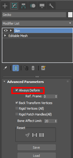 5)skin의 advanced parameters에서 always deform을 체크해제한다.