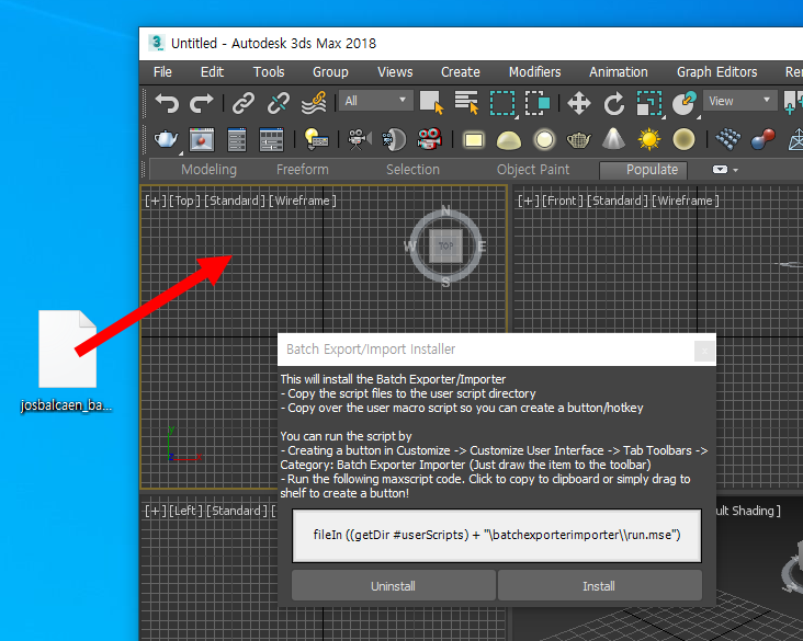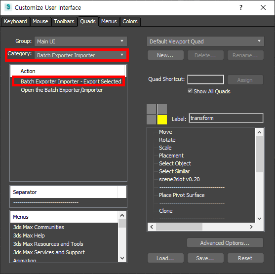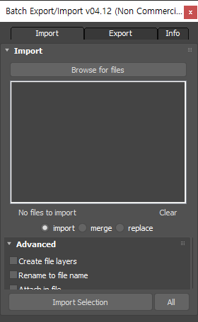 3D 오브젝트의 내보내기 및 가져오기(export/import) 작업을 일괄처리하는 스크립트이다. 씬에 존재하는 다수의 오브젝트를 파일로 내보내기할때 또는 폴더에 존재하는 다수의 오브젝트 파일을 씬으로 가져오기할때 처리과정을 자동화하여 시간을 절약할수있는 스크립트이다. max, obj, fbx, 3ds, ase, dwf, dwg, dxf, dae 포맷을 지원한다.