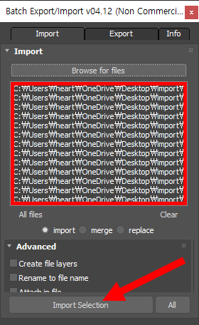 8)browse for files를 클릭하고 폴더를 설정하여 파일목록을 추가하고 하단의 import selection을 클릭하면 순차적으로 오브젝트 가져오기를 진행한다.