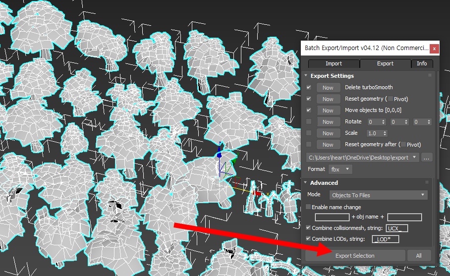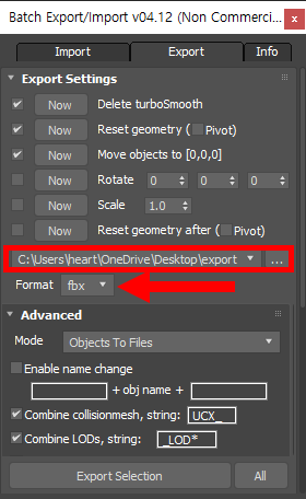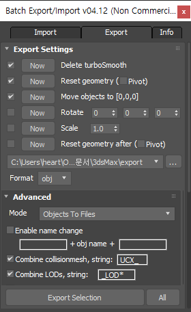 4)파일의 형식과 파일의 저장 위치를 설정한다. export settings, advanced에서 지오메트리 초기화, 트랜스폼 설정(위치,회전,스케일), 이름재설정(prefix/postfix)등의 유용한 옵션을 제공한다.