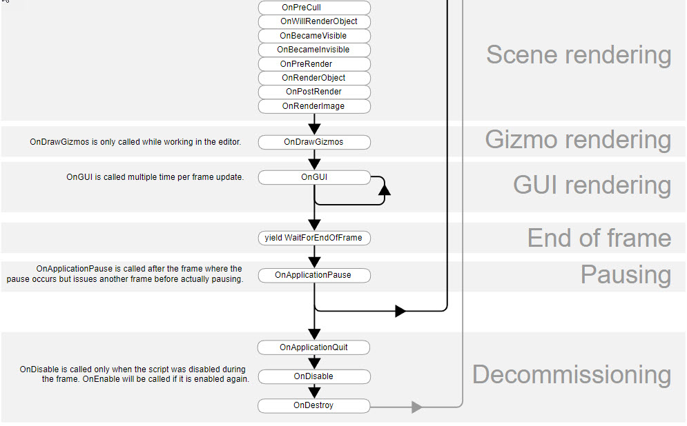 Instantiating Prefabs at run time Order of execution for event functions Running a Unity script executes a number of event functions in a predetermined order. This page describes those event functions and explains how they fit into the execution sequence.