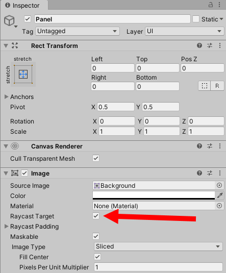 3)panel의 image 컴포넌트에서 raycast target이 체크되어있는것을 확인할수있다.