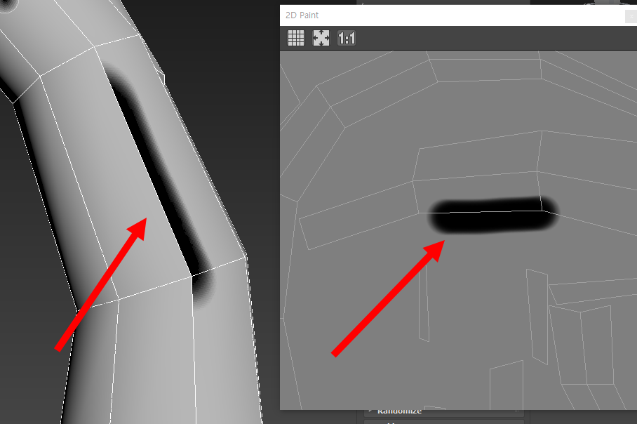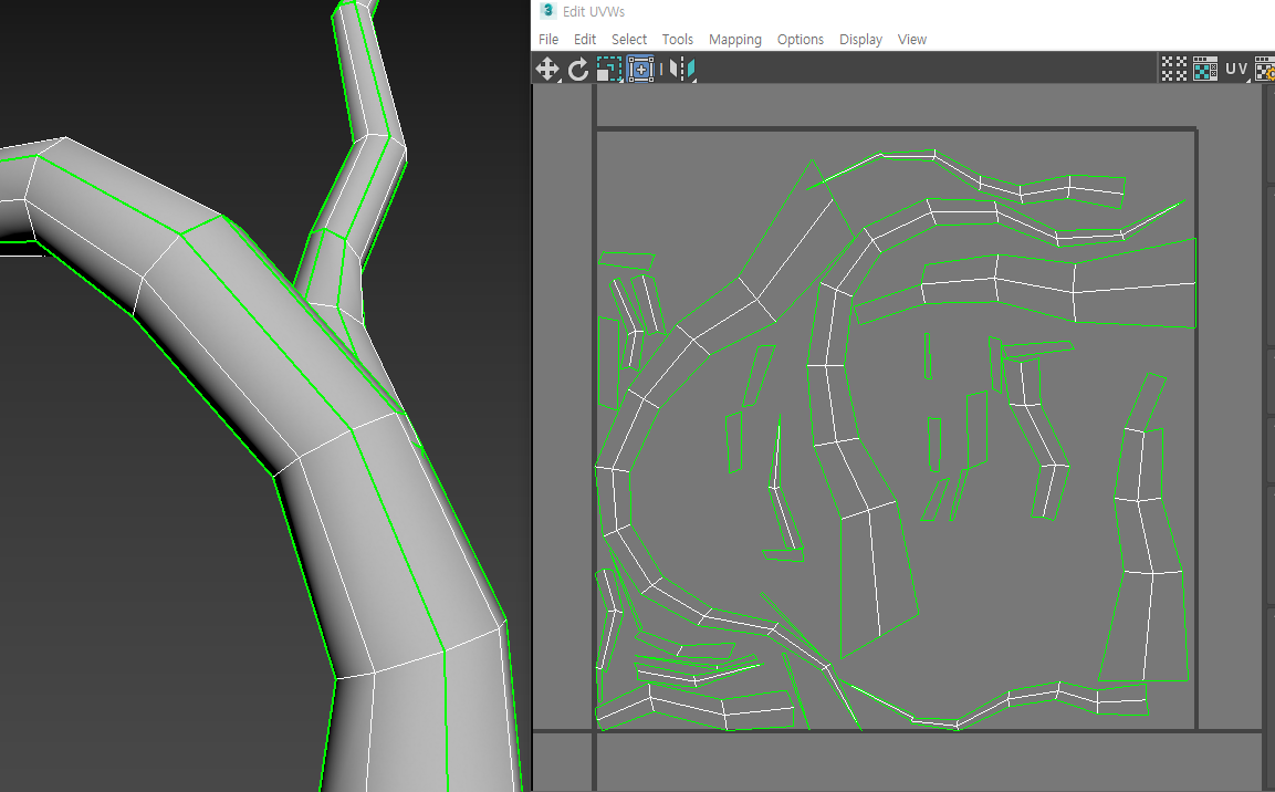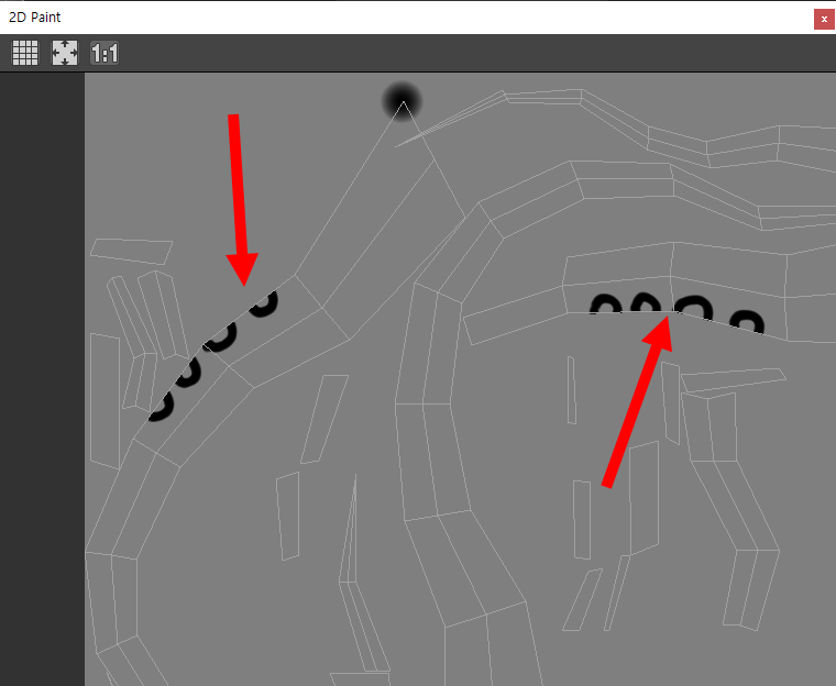 1)예에서 오브젝트의 uv가 불연속적인것을 확인할수있다. 이러한 경우 포토샵과 같은 2D 페인팅 프로그램에서 오브젝트 표면에 흐름이 연속적인 텍스처맵을 제작하기 쉽지않다.