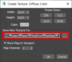 4)텍스처 맵의 해상도와 파일의 저장위치를 설정하고 확인한다.