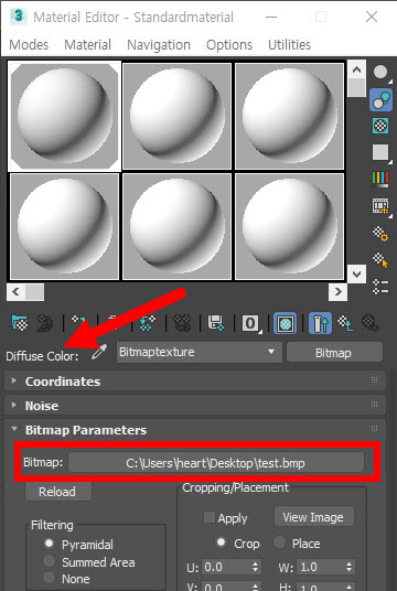 5)새로 생성한 텍스처가 해당 오브젝트의 재질에서 diffuse color의 비트맵으로 설정되어있는것을 확인할수있다.