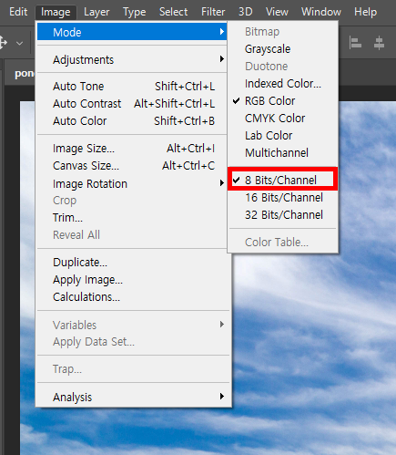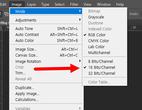 2)상단 image 메뉴의 mode에서 16bits/channel로 설정되어있는지 확인한다.