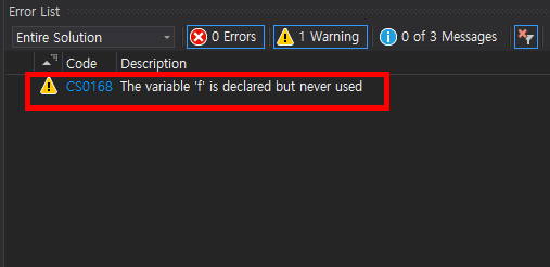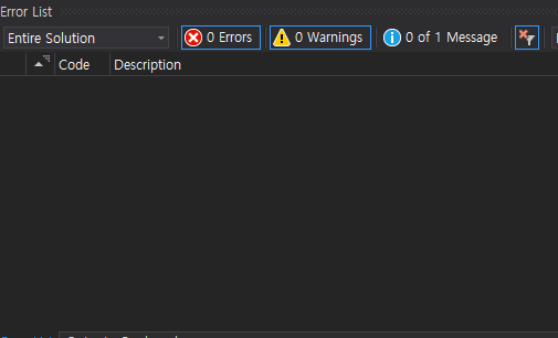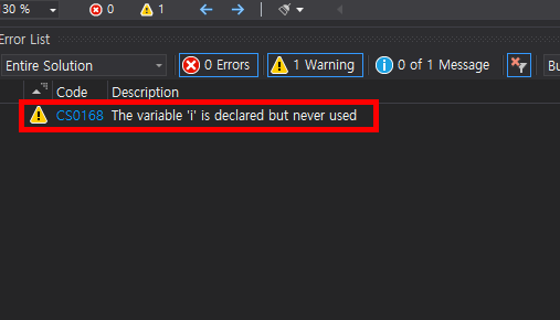 2)컴파일 및 코드 분석결과 하단에 있는 오류 목록에 경고를 표시한다.