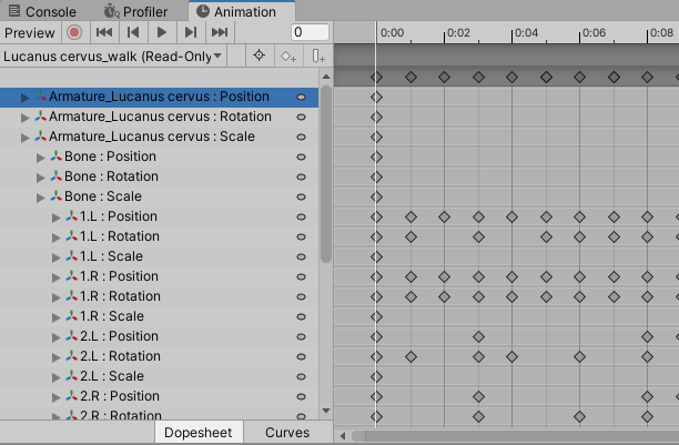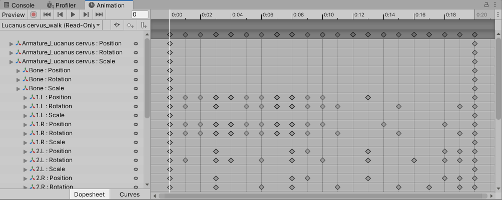 2)animation view에서 게임 오브젝트가 사용하는 애니메이션(우측 타임라인) 및 해당 애니메이션에 의해 제어되는 게임 오브젝트, 속성 목록(좌측)을 확인할수있다.