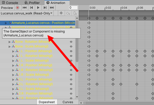 3)씬에서 게임 오브젝트의 이름을 변경하면 animation view에서 해당 게임 오브젝트 및 하위 게임 오브젝트의 속성 목록이 노란색으로 표시되며 애니메이션이 동작하지않는다(the gameobject or component is missing)