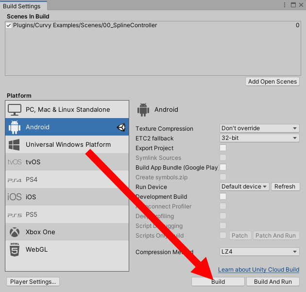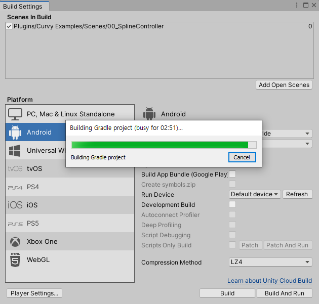 6)build settings에서 안드로이드의 build 버튼을 클릭하고 파일의 위치를 저장하면 최종적으로 빌드를 시작한다.