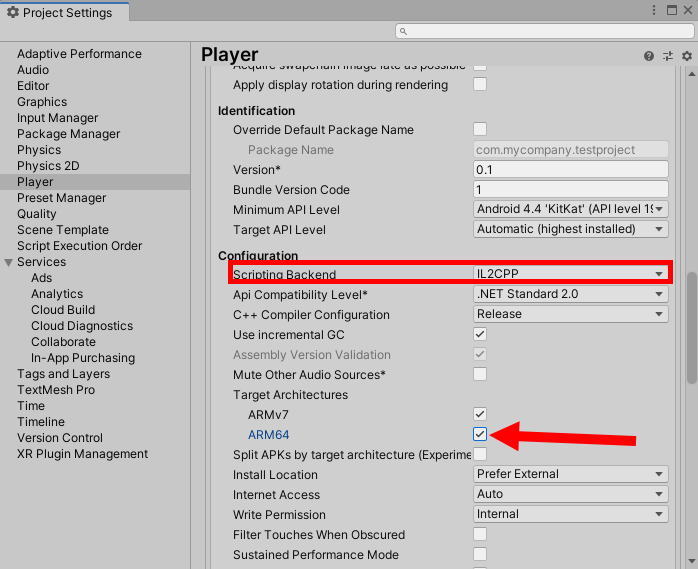 5)64비트 아키텍처를 지원해야한다면 IL2CPP를 선택하고 하단의 target architectures에서 ARM64에 체크한다.