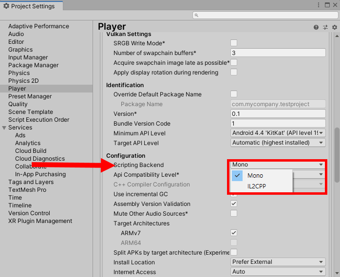 4)scripting backend에서 mono 또는 IL2CPP를 선택한다.