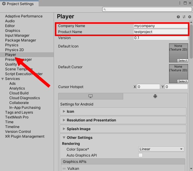 1)project settings의 player에서 회사명, 상품명(company name, product name)을 입력한다.