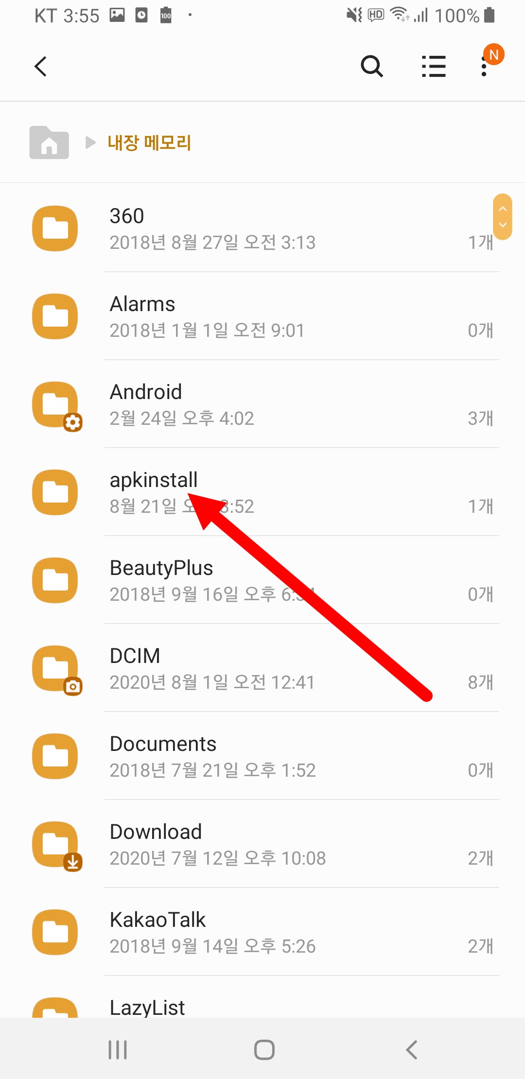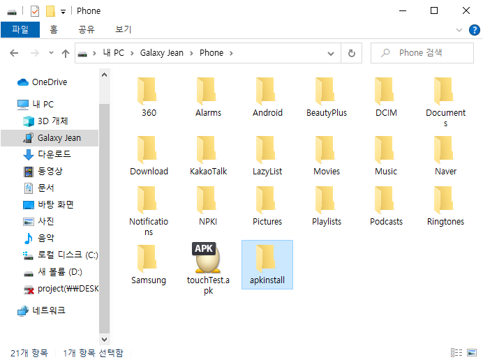 4)예에서 새로 생성한 폴더의 이름을 apkinstall로 설정하였다.