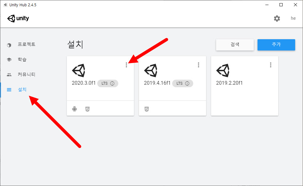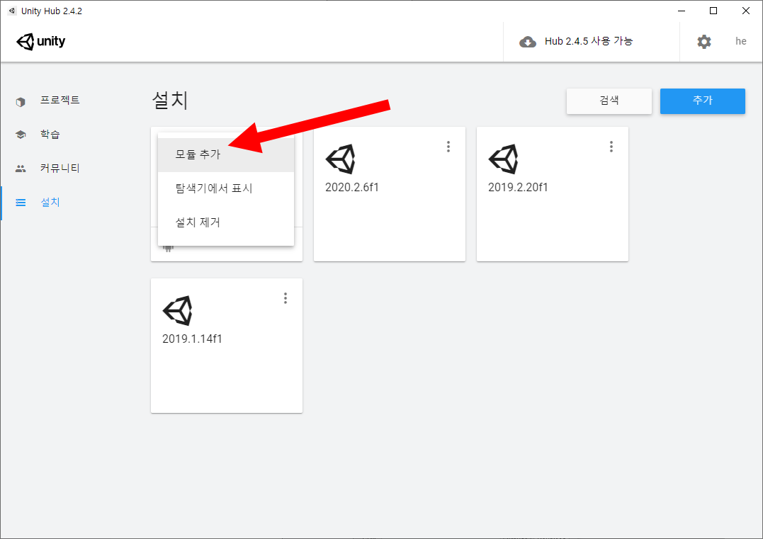 1)유니티 허브에서 설치 메뉴로 이동하고 모듈을 추가하려는 버전의 에디터를 선택한다.