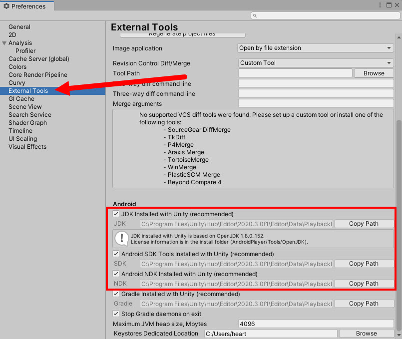 6)에디터를 재시작하고 preferences로 이동한다. external tools의 android에서 SDK, NDK 및 OpenJDK의 설치 경로가 정상적으로 설정되어있는것을 확인할수있다.