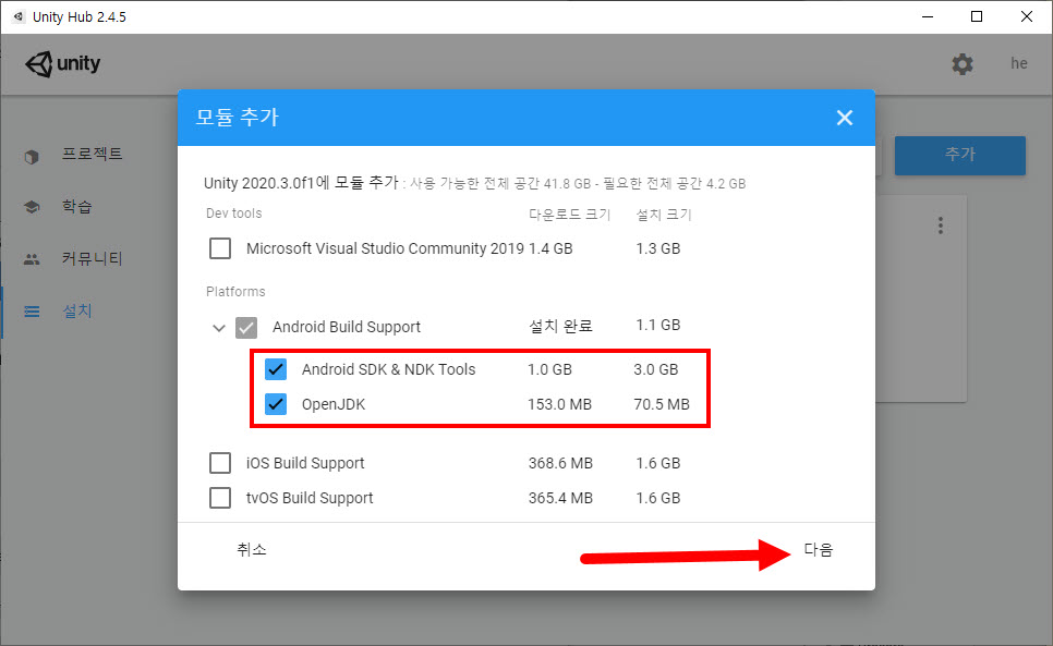 3)android SDK, NDK Tools와 openJDK에 체크하고 다음으로 이동한다.