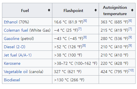 다양한 물질의 인화점(flash point)