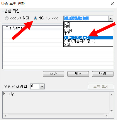 6)변환타입에서 NGI>>xxx에 체크하고 SHP(수치지도)를 선택한다.