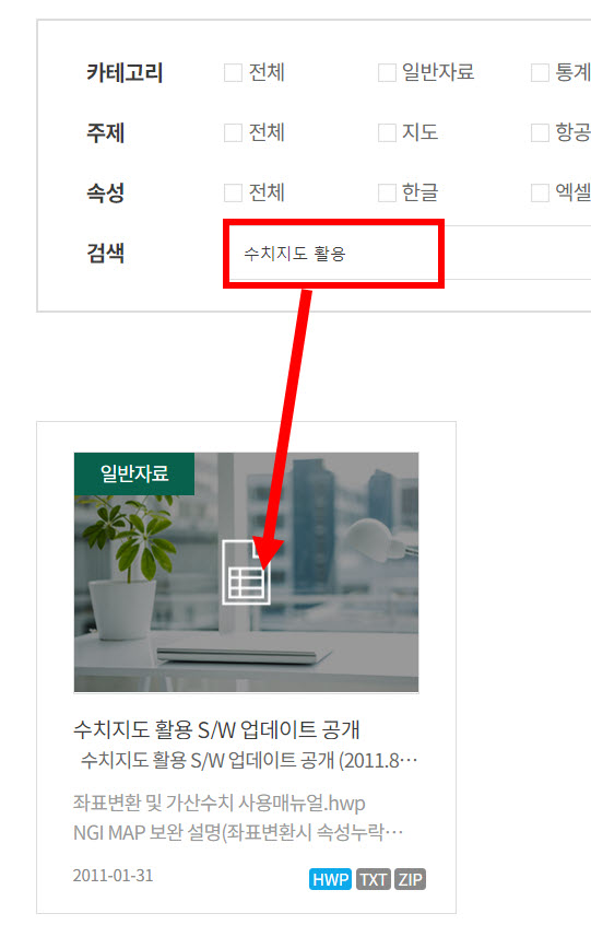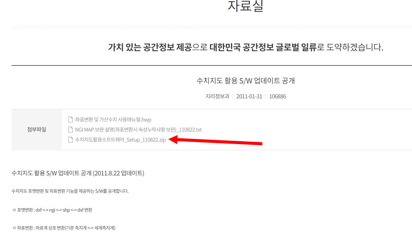3)'수치지도 활용'을 검색하여 공개된 수치지도 활용 소프트웨어 자료로 이동한다.