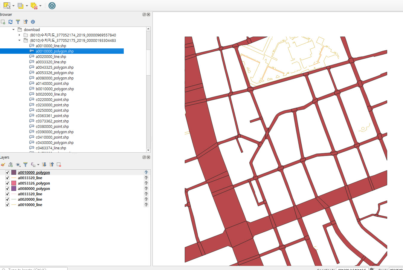 10)shp파일은 qgis등의 gis프로그램에서 지원하며 정상적으로 표시한다.
