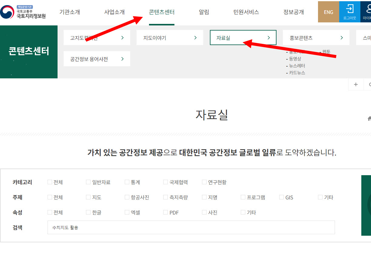 2)국토지리정보원 웹사이트에서 콘텐츠센터의 자료실로 이동한다.