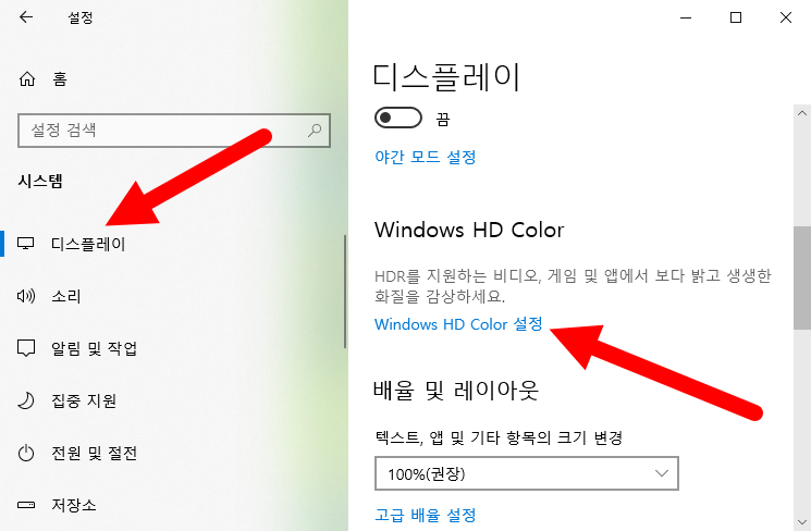 3)디스플레이 메뉴에서 windows HD color 설정으로 이동합니다.