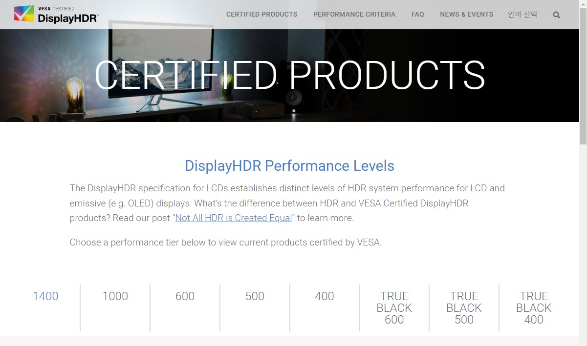 DisplayHDR은 HDR 품질 및 성능에 대한 개방형 표준으로 VESA의 고성능 모니터 및 디스플레이 적합성 테스트 사양을 충족하는 디스플레이에만 DisplayHDR 로고가 표시될수있다. 아래 웹사이트에서 VESA 테스트 및 인증을 받은 DisplayHDR 또는 DisplayHDR True Black 제품의 목록을 참고할수있다.
