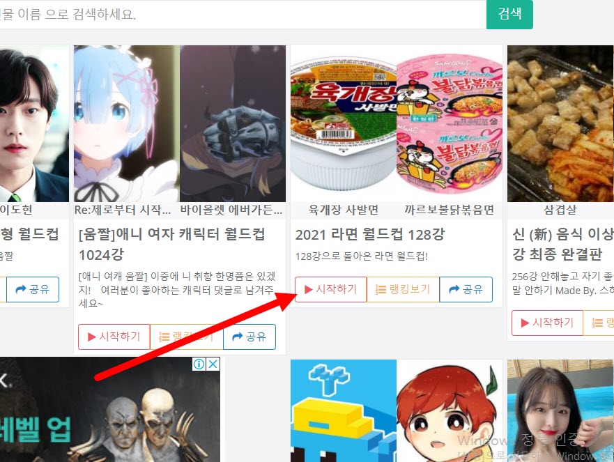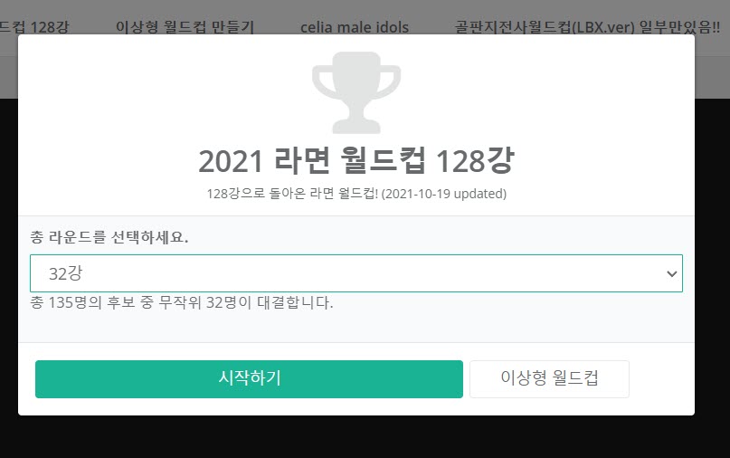 음식, 영화, 인물, 상황등 다양한 분야에 대한 이상형 월드컵을 진행할수있는 웹사이트이다. 웹사이트에서 주제를 선택하고 토너먼트 형식의 이상형 월드컵을 시작할수있고 다른 이용자들이 선택한 우선순위 및 랭킹을 확인할수있다.