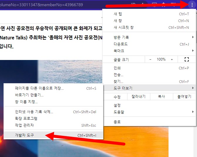 2)이미지 우클릭을 사용할수없는 경우 크롬브라우저 우측 상단의 설정에서 도구 더보기의 개발자 도구로 이동한다.