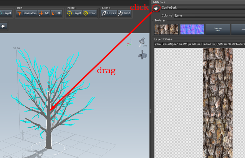 6)재질을 오브젝트에 적용하기위해 아래 표시한 아이콘을 클릭, 드래그하여 나무의 trunk에 드롭합니다.