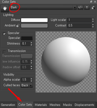 9)이 재질은 diffuse, specular와 같은 표면성질의 정도를 color sets탭의 bark에서 설정합니다.