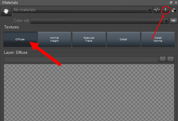 3)textures의 diffuse를 선택하고 Materials의 우측 상단에서 아래 표시한곳을 클릭합니다.