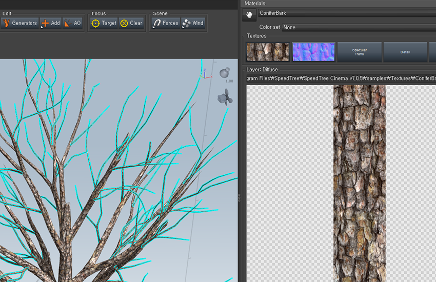 4)스피드트리에서 기본적으로 제공하는 나무 텍스처를 추가합니다(bark)