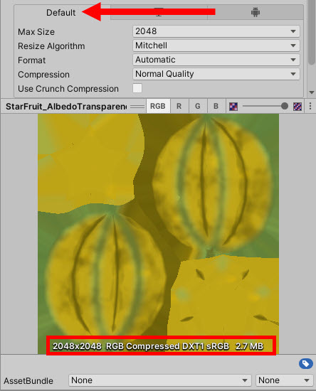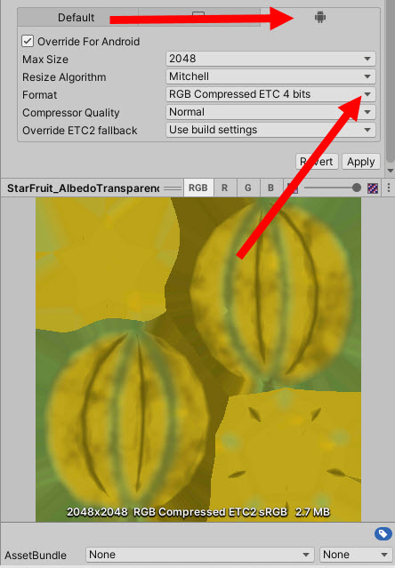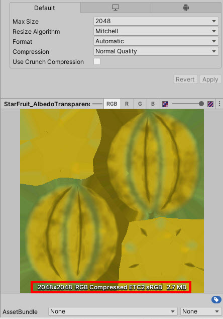 예에서 안드로이드 플랫폼의 프로젝트에서 유니티가 이미지 소스 파일의 PNG 형식을 ETC2 형식으로 자동 변환한것을 확인할수있다.
