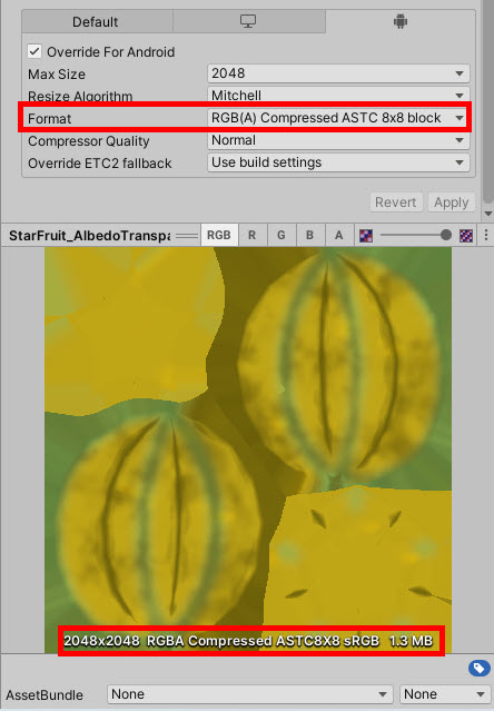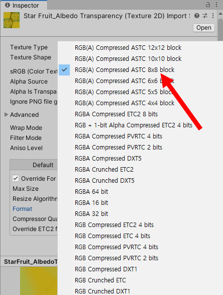 특정 플랫폼 오버라이드를 사용하여 플랫폼에 대한 텍스처 압축형식을 재정의할수있다. 플랫폼을 선택하고 override for platform에 체크한후 format에서 텍스처 압축형식을 선택한다.