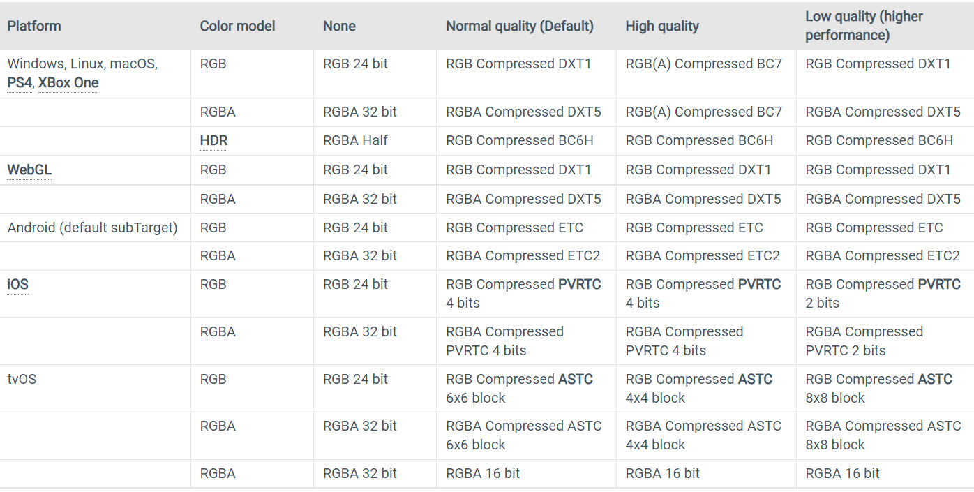 아래 표는 유니티에서 각 플랫폼에 대하여 기본적으로 사용하는 텍스처 압축 형식을 보여준다. 각 플랫폼의 compression 옵션(low quality, normal quality, high quality)에 대한 텍스처 압축 형식들을 확인할수있다.
