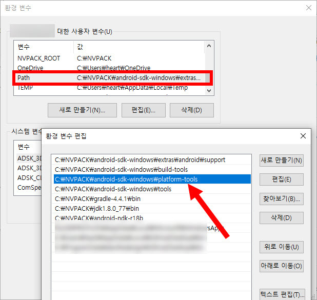 5)path의 환경 변수 편집에서 안드로이드 sdk 플랫폼 도구의 경로를 확인할수있다.