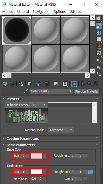 1)새로운 physical 재질에서 base color와 reflections을 다음과 같이 설정하였다.