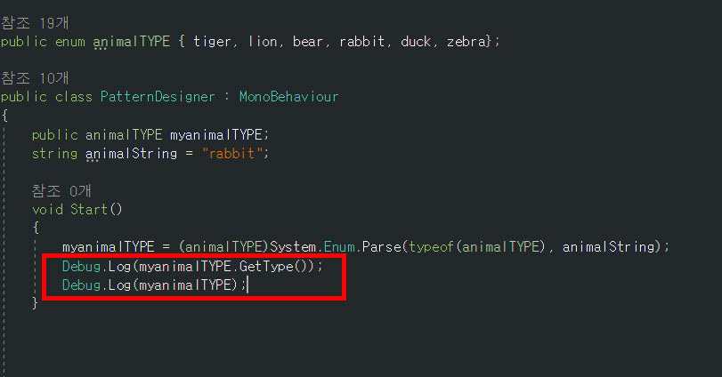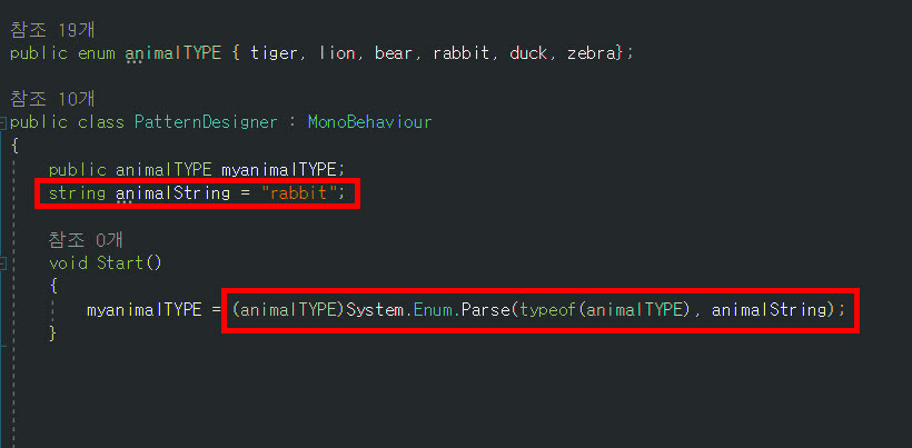 2)Enum.Parse 함수의 매개변수로 열거형 형식(typeof(animalTYPE))과 문자열을("rabbit")을 지정한다.
