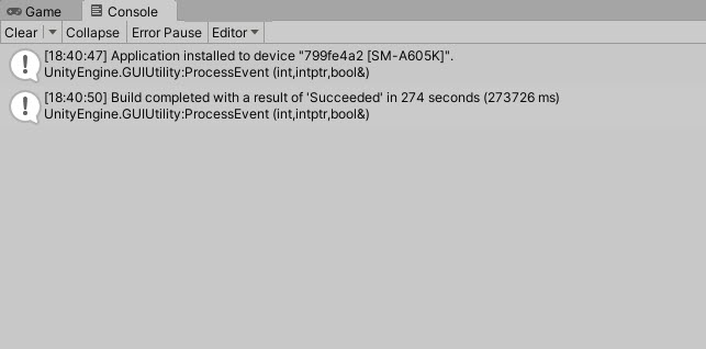 2)빌드가 완료되면 모바일 장치에 어플리케이션이 설치되며 게임이 실행된다.