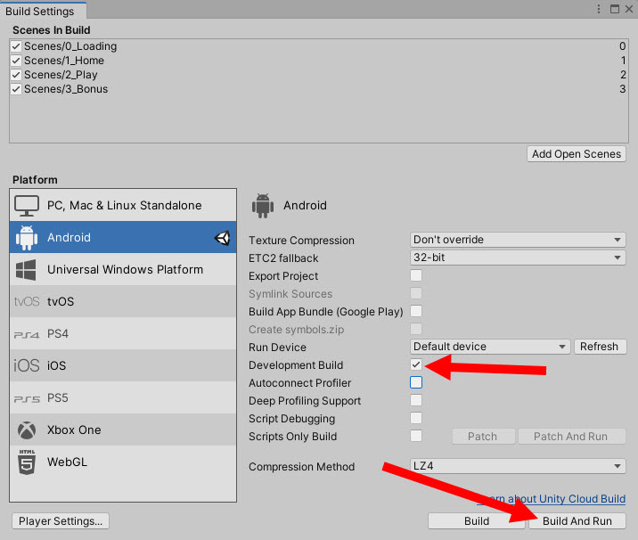 1)데스크톱에 모바일 장치를 연결하고 build settings에서 development build에 체크하고 build and run을 클릭한다(빌드를 시작하기전에 모바일 장치에서 USB디버깅을 허용해야한다)