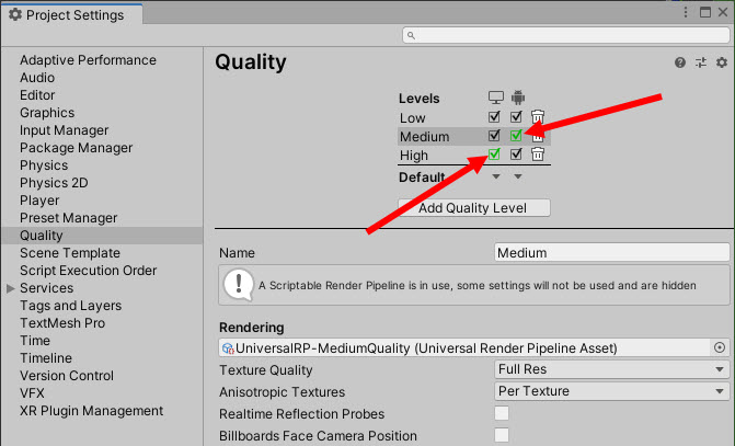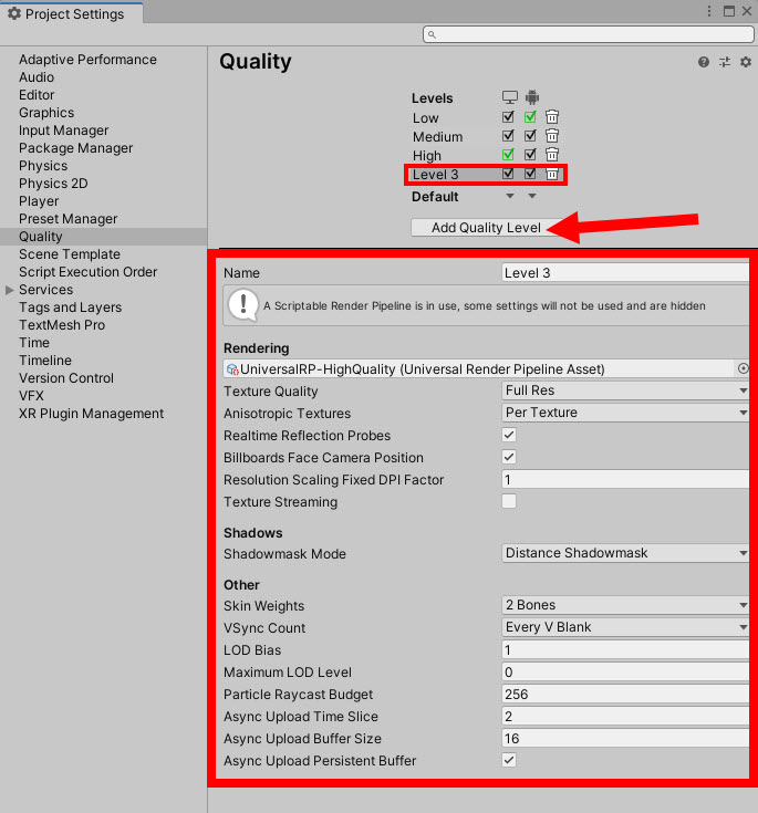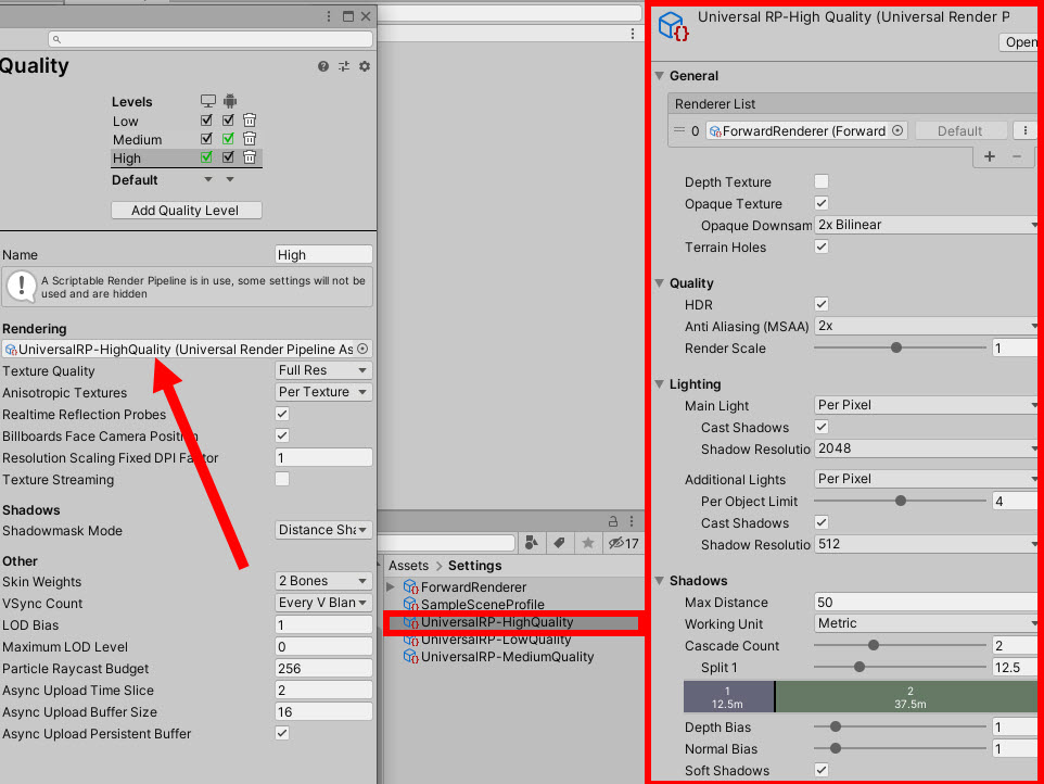 4)URP의 경우 각 레벨에 대한 렌더 파이프라인 에셋이 설정되어있다.